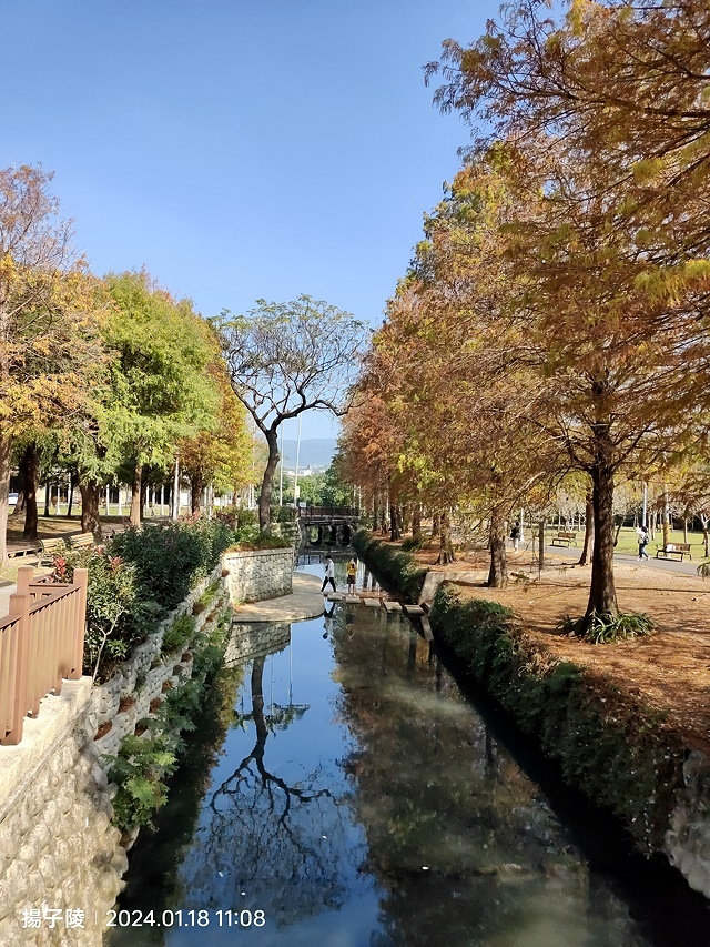 站在水圳的石階上,看著落羽松倒映的水景,好像有一絲在外國的異國風情。