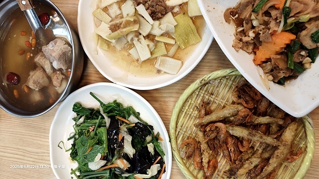 菜色包括:溪蝦溪魚雙拼,清爽又開胃,讓人一口接一口;還有暖暖的山藥排骨湯,喝了心頭暖呼呼~